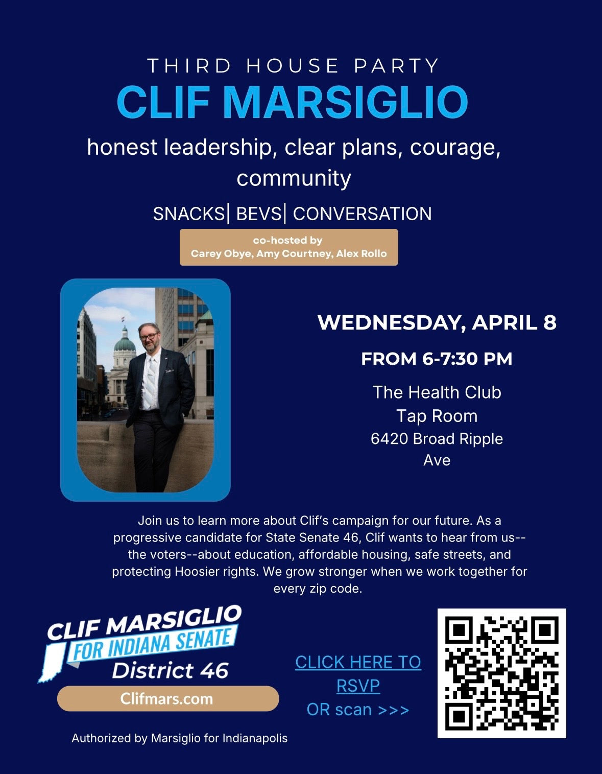 From 6-7:30pm Join Indiana Senate candidate Clif Marsiglio at The Health Club for conversations about education, affordable housing, protecting Hoosier rights & more!