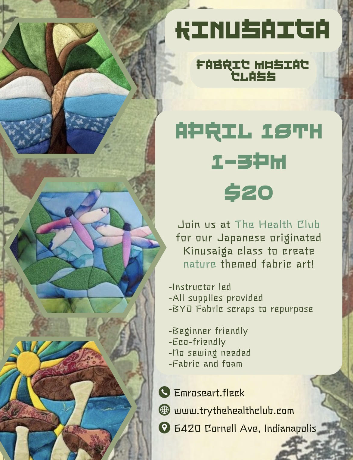 From 1-3pm at The Health Club, learn the Japanese art of Kinusaiga. Create eco-friendly fabric art using using recycled textiles to make vibrant, textured mosaics. (No sewing needed)