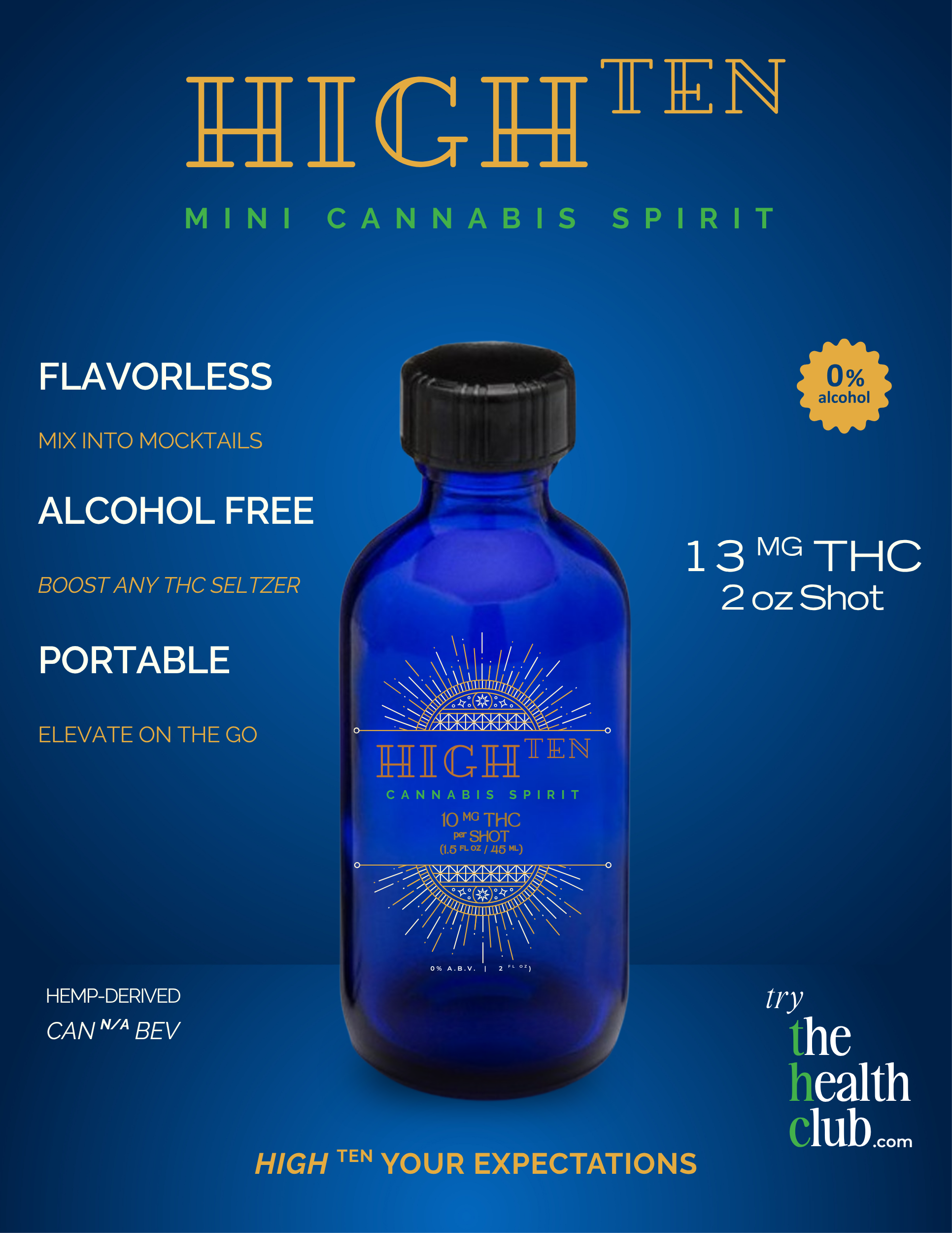 'HIGH-TEN' YOUR EXPECTATIONS WE CREATED A FLAVORLESS CANNABIS SPIRIT FOR YOU TO HAVE YOUR CAKE... AND EAT IT, TOO. ENJOY THE SAME GREAT TASTE OF YOUR FAVORITE DRINKS... ELEVATED ON DEMAND.